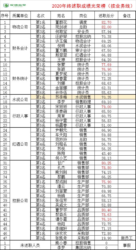 2020年終述職活動給參加的員工帶來了一場拓展知識、提升眼界的饗餐盛宴。因為它有利于公司團隊人才建設、有利于提升領導者的管理水平,有利于公司挖掘出人才。為激勵述職活動優秀者、鞭策述職后進員工奮起直追。經集團人事部三位成員細心、仔細的復核六位評委述職評分數據,最終于2020年12月26日公布了述職活動中“狀元、榜眼、探花”等,他/她們是董群花、宛劍波、曹夢宇、甘廣、宋嬌嬌、孔杰、黎森兵、張蒙、張穎、譚冬霞等十名優勝者,具體詳見排名表。集團公司號召全體員工向“榜樣”學習“勤勉好學、刻苦鉆研、潛心精進”的工匠精神。機會永遠留給有準備的人,愛德森堡伙伴們一起弘揚中國女排精神,讓我們攜手奮戰2021!
