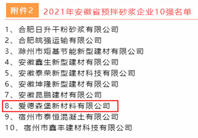 9月中旬,安徽省經濟和信息化廳公布了2021年安徽省預拌混凝土企業20強和預拌砂漿企業10強名單,愛德森堡第二次入圍,榮獲安徽省預拌砂漿企業十強。